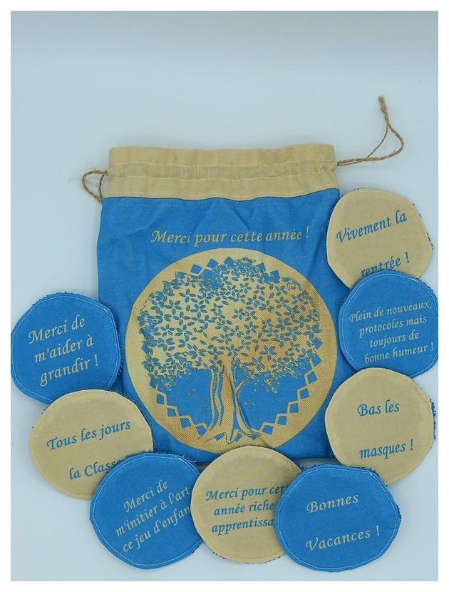 Je vous propose ce lot de 8 lingettes démaquillantes avec petits messages et son pochon de transport. Idéal pour cadeau de fin d'année à la maitresse ou Atsem de votre enfant. Facile à transporter même en vacances. Les lingettes sont de 8cm de diamètre environ, une face en coton avec message et une face en éponge bambou bleu. Le pochon avec un motif d'arbre est doublé et ferme avec une ficelle en jute.